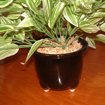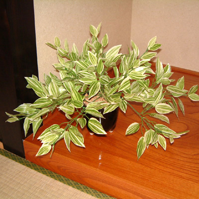 鉢は黒い光沢のある三本足のものにしてみました。黄緑色と白色の少し丸みがかった小さな葉がたくさんついたまめささです。枝の流れを変えると和にも洋にも表情が変わります。